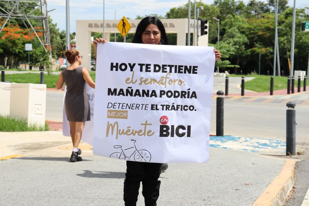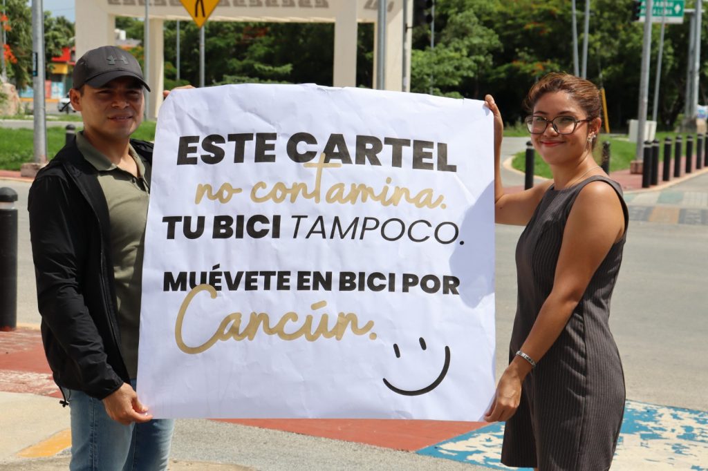 Con frases llamativas como “¿Estrés? Bájate del auto y da una caminata” o “Este cartel no contamina. Tu bici tampoco. Muévete en bici por Cancún”, el personal del IMPLAN invitó a la ciudadanía a reflexionar sobre sus hábitos de transporte, generando sonrisas y, al mismo tiempo, conciencia sobre alternativas como caminar, usar bicicleta o transporte público.
